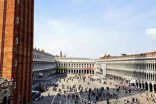 The square is also home to the Biblioteca Nazionale Marciana, which houses a world-renowned collection of ancient manuscripts; the Museo Correr, which offers a glimpse into Venetian history and art; Caffè Florian, which opened in 1720 and remained open during the war; and the Renaissance clock tower (Torre dell’Orologio). Restaurants, cafes, and shops line the square.